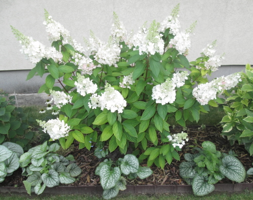 Kúp alakú virágbugáit az erős, felálló hajtásain hozza, melyeket többnyire steril virágok alkotnak,